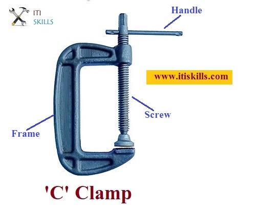 ‘C’ क्लैंप का उपयोग वर्कशॉप में जॉब या वर्कपीस को मशीन की सतह पर  बांधने के कार्य  में लाया जाता है जिससे जॉब पर आसानी से संक्रियाए (Operations) की जा सके |