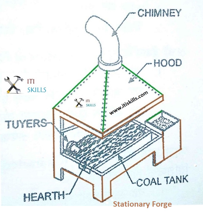 स्टेशनरी फोर्ज को अग्नि ईट(Fire Bricks) और मिटटी (Clay) को मिलाकर बनाया जाता है | इस भट्टी के ऊपरी भाग में हुड(Hood) बना होता है जिसका कार्य धुए को एकत्रित करना होता है | हुड के ऊपर धुआं को बाहर निकालने के लिए चिमनी(Chimney) लगी होती है | फोर्ज के अन्दर हवा प्रवाहित करने के लिए ब्लोअर (Blower) का प्रयोग किया जाता है | स्टेशनरी फोर्ज में एक पानी का टैंक(Tank) भी होता है जिसका प्रयोग जॉब को ठंढा करने तथा आग को नियंत्रित करने में किया जाता है |