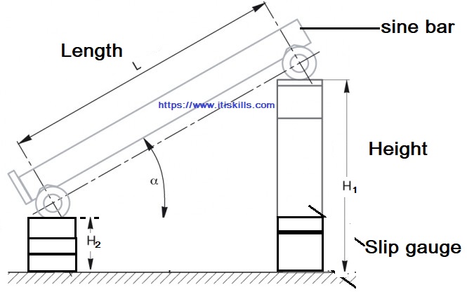 माना पहले रोलर के नीचे की स्लिप गेजों की ऊचाई  =h1                                                                                              दुसरे रोलर के नीचे की स्लिप गेजों की ऊचाई  =h2                                                                                                      साइन बार की लम्बाई = L                                                                                                                                          तथा स्लिप गेजों का अंतर, h = h1 -h2                                                                                                                       sine α  = (h1 -h2) / L                                                                                                                                                 साइन बार की सहायता से अन्य टेपर मापी यंत्रो की अपेक्षा अधिक परिशुद्धता से मान ज्ञात किया जाता है |